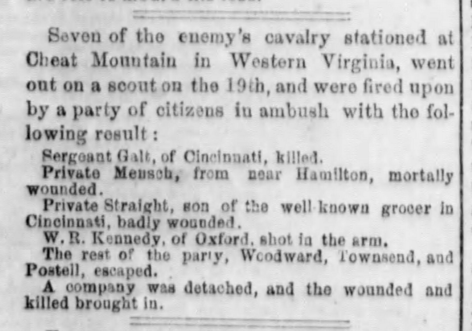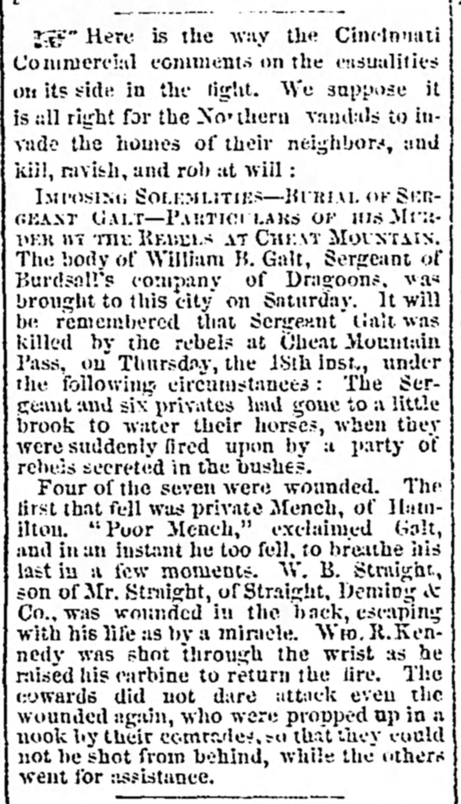 In summary, Sgt. William D. Gault of Burdsall’s Dragoons led a seven-member patrol from Cheat Mountain east toward the Greenbrier River in what is today Pocahontas County, West Virginia. As they were resting their horses at a stream, they were bushwhacked by an unknown number of Confederate sympathizers. Sergeant Gault was killed outright, one man mortally wounded, and two wounded. Their compatriots escaped and returned with a larger force to collect their casualties.
