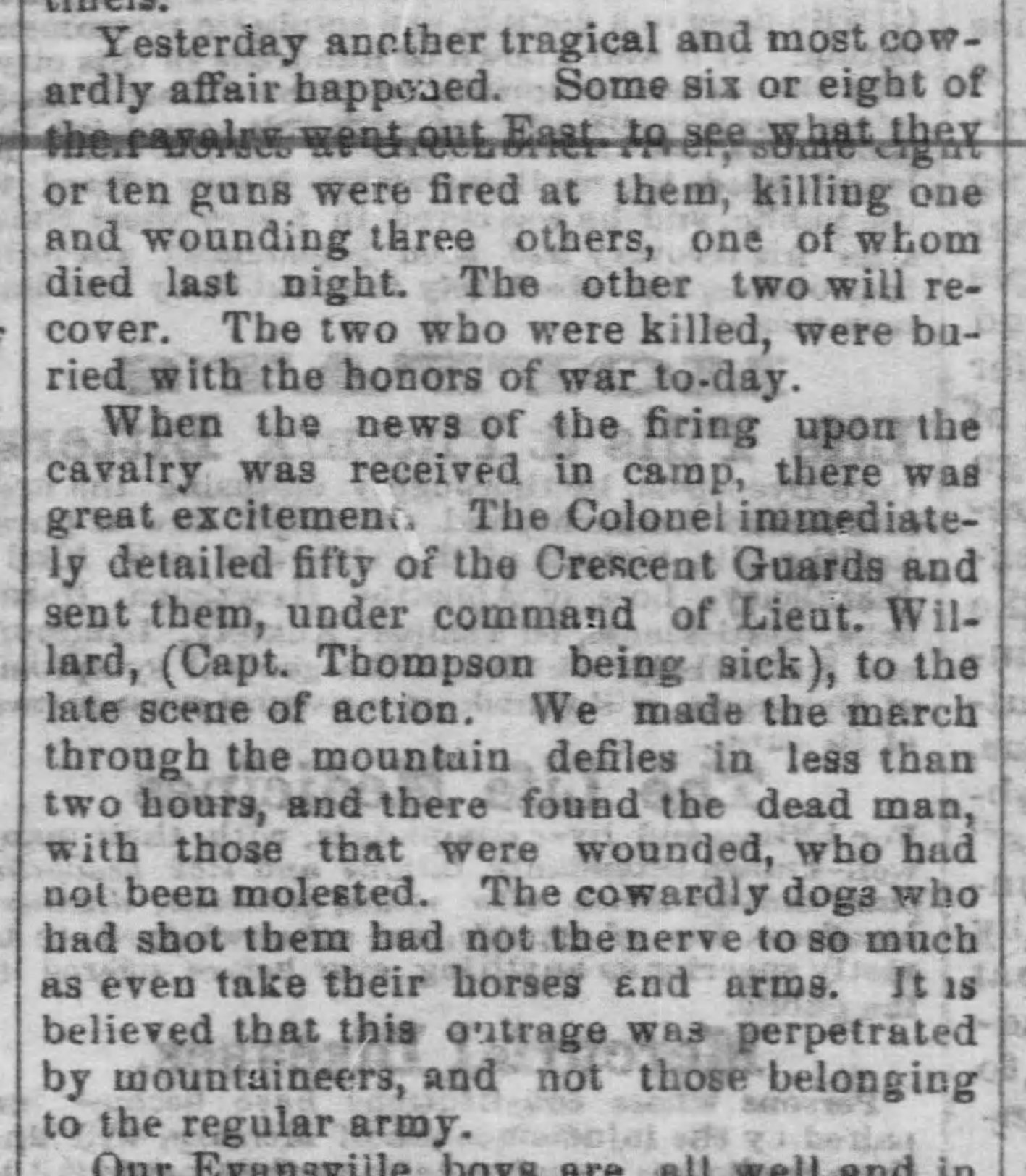 So based on this new information, I can say with some confidence that Sgt. Gault’s patrol was ambushed on July 19, 1861. But ambushed by whom? That remains a mystery.