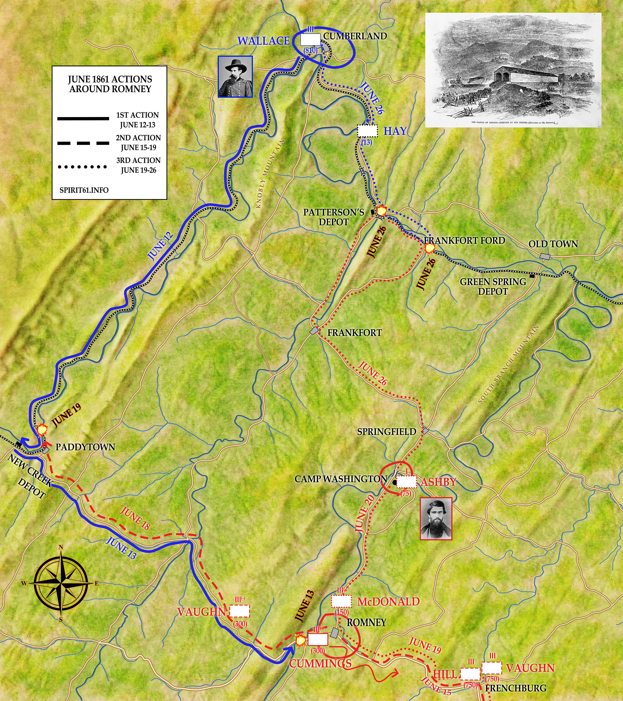I’m proud to announce our first official map–depicting the actions around Romney, Virginia (today, West Virginia) in June 1861, which pitted Lew Wallace’s Indiana zouaves against a variety of Confederate forces sent to secure the area. Romney was a hotbed of secessionist support and Confederate forces there threatened the Baltimore & Ohio Railroad, which Lew Wallace was tasked to protect.