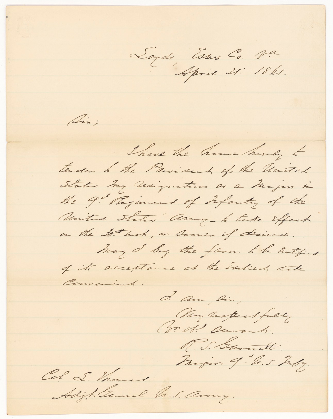 As a U.S. Army officer, he rose to the rank of major in the 9th United States Infantry and was stationed in Washington Territory. Tragically, both his wife and child died of illness in 1858, sinking him into a deep melancholy and depression. He took a leave of absence in Europe that lasted for over two years. After the Virginia Convention adopted the Ordinance of Secession on April 17, 1861, Garnett resigned from the United States Army. The following is a scan of his resignation letter from the National Archives:
