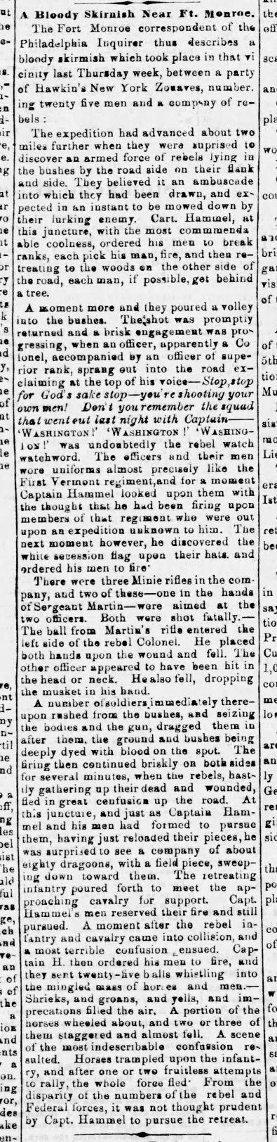 The Fort Monroe correspondent of the Philadelphia Inquirer thus describes a bloody skirmish which took place in that vicinity last Thursday week, between a party of Hawkins’s New York Zouaves, numbering twenty five men and a company of rebels: