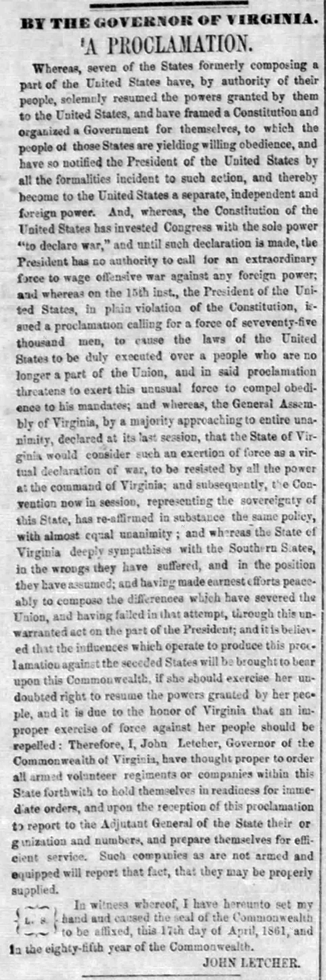 Whereas, seven of the States formerly composing a part of the United States have, by authority of their people, solemnly resumed the powers granted by them to the United States, and have framed a Constitution and organized a Government for themselves, to which the people of those States are yielding willing obedience, and have so notified the President of the United States by all the formalities incident to such action, and thereby become to the United States a separate, independent and foreign power. And, whereas, the Constitution of the United States has invested Congress with the sole power “to declare war,” and until such declaration is made, the President has no authority to call for an extraordinary force to wage offensive war against any foreign power; and whereas on the 15th inst., the President of the United States, in plain violation of the Constitution, issued a proclamation calling for a force of [seventy]-five thousand men, to cause the laws of the United States to be duly executed over a people who are no longer part of the Union, and in said proclamation threatens to exert this unusual force to compel obedience to his mandates; and whereas, the General Assembly of Virginia, by a majority approaching to entire unanimity, declared at its last session, that the State of Virginia would consider such an exertion of force as a virtual declaration of war, to be resisted by all the power at the command of Virginia; and subsequently, the Convention now in session, representing the sovereignty of this State, has re-affirmed in substance the same policy, with almost equal unanimity; and whereas the State of Virginia deeply [sympathizes] with the Southern States, in the wrongs they have suffered, and in the position they have assumed; and having made earnest efforts peaceably to compose the differences which have severed the Union, and having failed in that attempt, through this unwarranted act on the part of the President; and it is believed that the influences which operate to produce this proclamation against the seceded States will be brought to bear upon this Commonwealth, if she should exercise her undoubted right to resume the powers granted by her people, and it is due to the honor of Virginia that an improper exercise of force against her people should be repelled: Therefore, I, John Letcher, Governor of the Commonwealth of Virginia, have thought proper to order all armed volunteer regiments or companies within this State forthwith to hold themselves in readiness for immediate orders, and upon the reception of this proclamation to report to the Adjutant General of the State their organization and numbers, and prepare themselves for efficient service. Such companies as are not armed and equipped will report that fact, that they may be properly supplied.