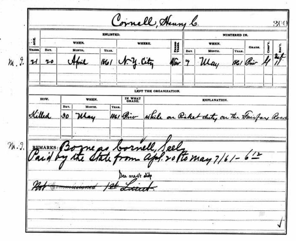 Those early reports were untrue. On June 2, 1861, the New York Daily Herald published the following, correcting the location of the skirmish in which Henry Seeley Cornell (sometimes Henry C. Cornell) of the Zouaves was killed: