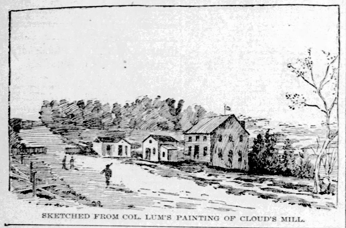 The mill owned by James Cloud, built between 1813 and 1816, was located approximately three miles west of Shuter’s Hill on the north side of Little River Turnpike, near Holmes’ Run. It was described as an unremarkable, four-story brick building, “noted for nothing but the millions of horrible fleas bred in its vicinity,” its wheel turned by a muddy stream mostly hidden by weeds and brush. Sometime near the end of May, Captain Ebenezer Butterworth and Company C, 1st Michigan, the “Coldwater Cadets” seized the mill and carried off 400 barrels of flour and hundreds of bushels of wheat.
