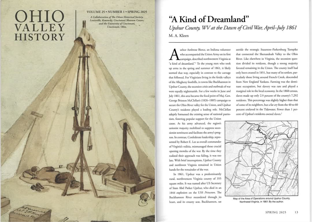 Appearing in the Spring 2025 issue of Ohio Valley History, “‘A Kind of Dreamland’: Upshur County, WV at the Dawn of Civil War” by M.A. Kleen is the first academic article to emerge from our work here at Spirit of ’61. This website strives to be a hub for research and scholarship of this interesting but often overlooked period of Civil War history.