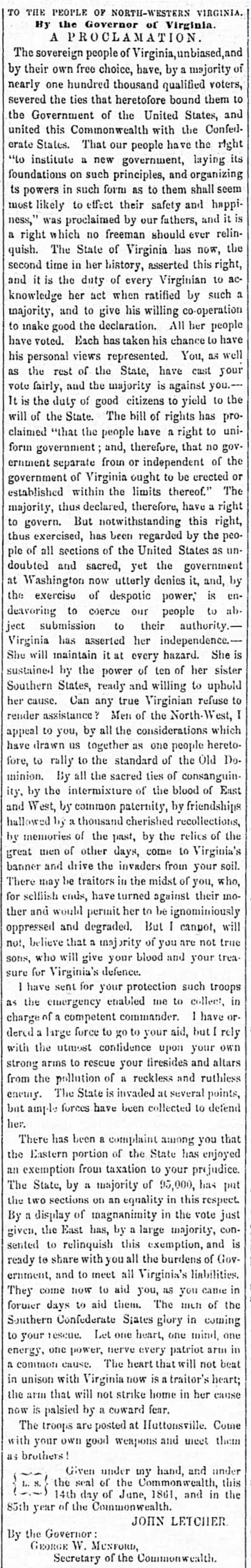 In the following proclamation, issued June 14, 1861, following the defeat of Confederate forces in Northwestern Virginia at Philippi, Letcher defended Virginia’s secession as both legal and democratic, citing a strong majority vote as justification for breaking ties with the United States and joining the Confederate States of America. He framed the decision as a continuation of the revolutionary spirit, asserting that Virginians had the right to form a new government in pursuit of their safety and happiness.