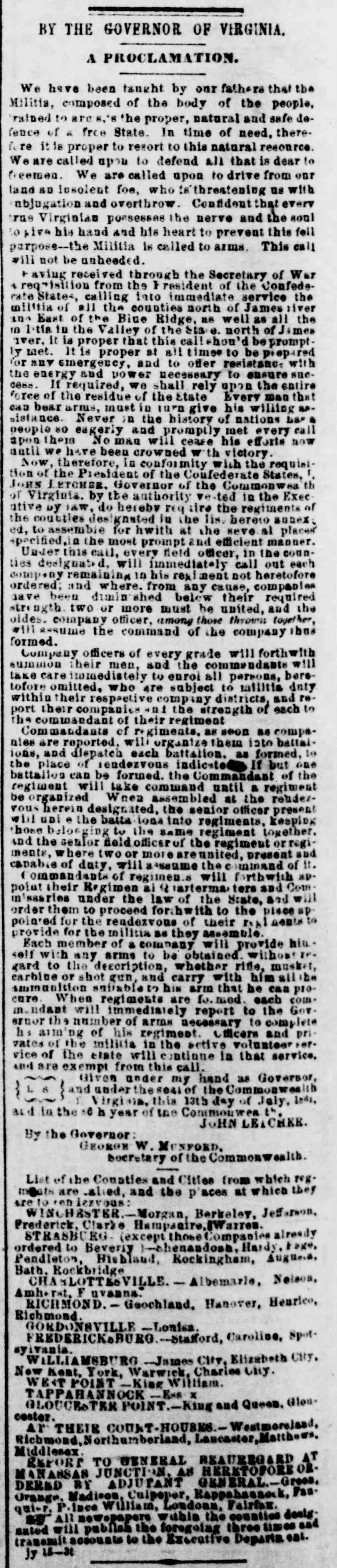Having received through the Secretary of War a requisition from the President of the Confederate States, calling into immediate service the militia of all the counties North of James River and and East of the Blue Ridge, as well as all the militia in the Valley of the State, North of James River, it is proper that this call should be promptly met. It is proper at all times to be prepared for any emergency, and to offer resistance with the energy and power necessary to ensure success. If required, we shall rely upon the entire force of the residue of the State. Every man that can bear arms, must in turn give his willing assistance. Never in the history of nations has a people so eagerly and promptly met every call upon them. No one will cease his efforts now until we have been crowned with victory.