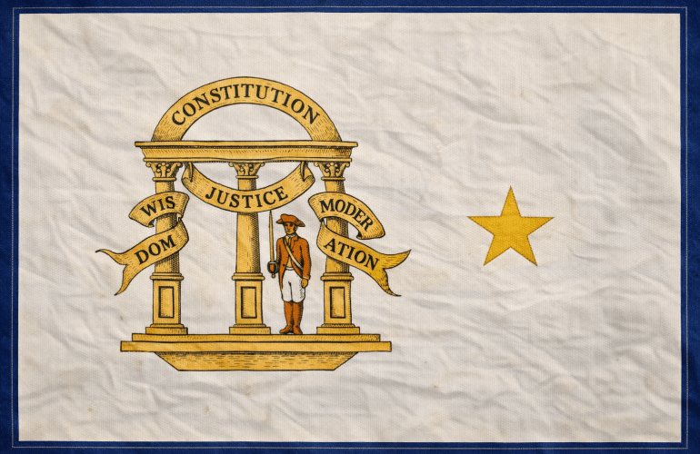 I’ve been unable to confirm the flag’s design, other than the following description from this website: “white field with blue trim; Georgia coat-of-arms on obverse together with a single star; Goddess of Liberty personified on reverse side.”