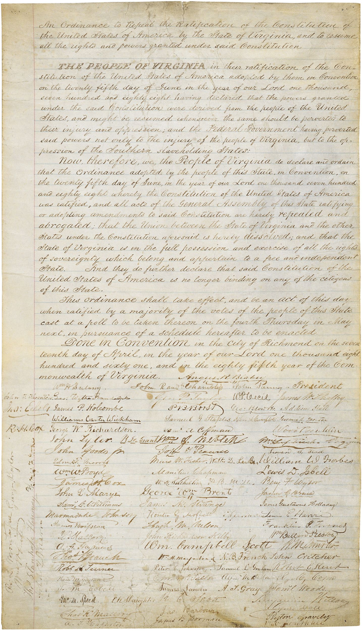 Done in Convention, in the city of Richmond, on the seventeenth day of April, in the year of our Lord one thousand eight hundred and sixty-one, and in the eighty-fifth year of the Commonwealth of Virginia