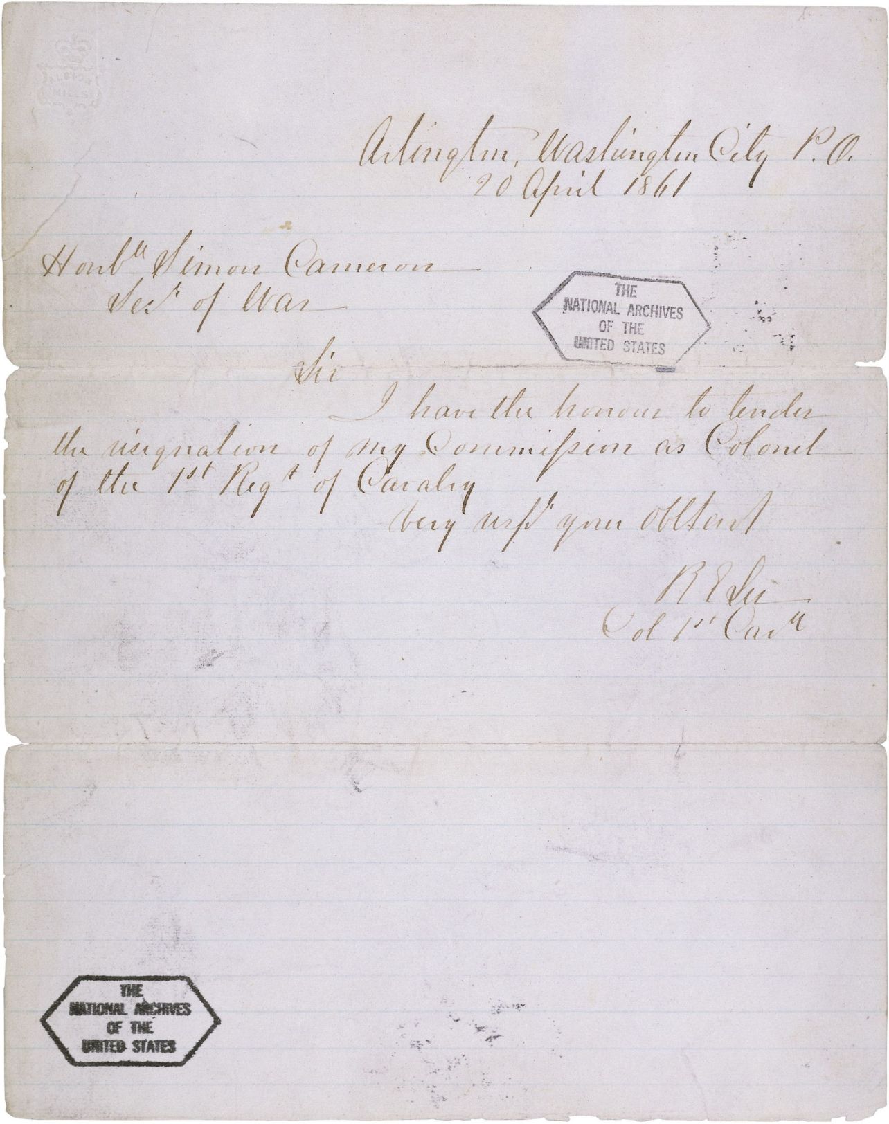 Two days later, on April 20th, Lee resigned his commission in the U.S. Army. His letter to Secretary of War Simon Cameron, transcribed above, was brief.