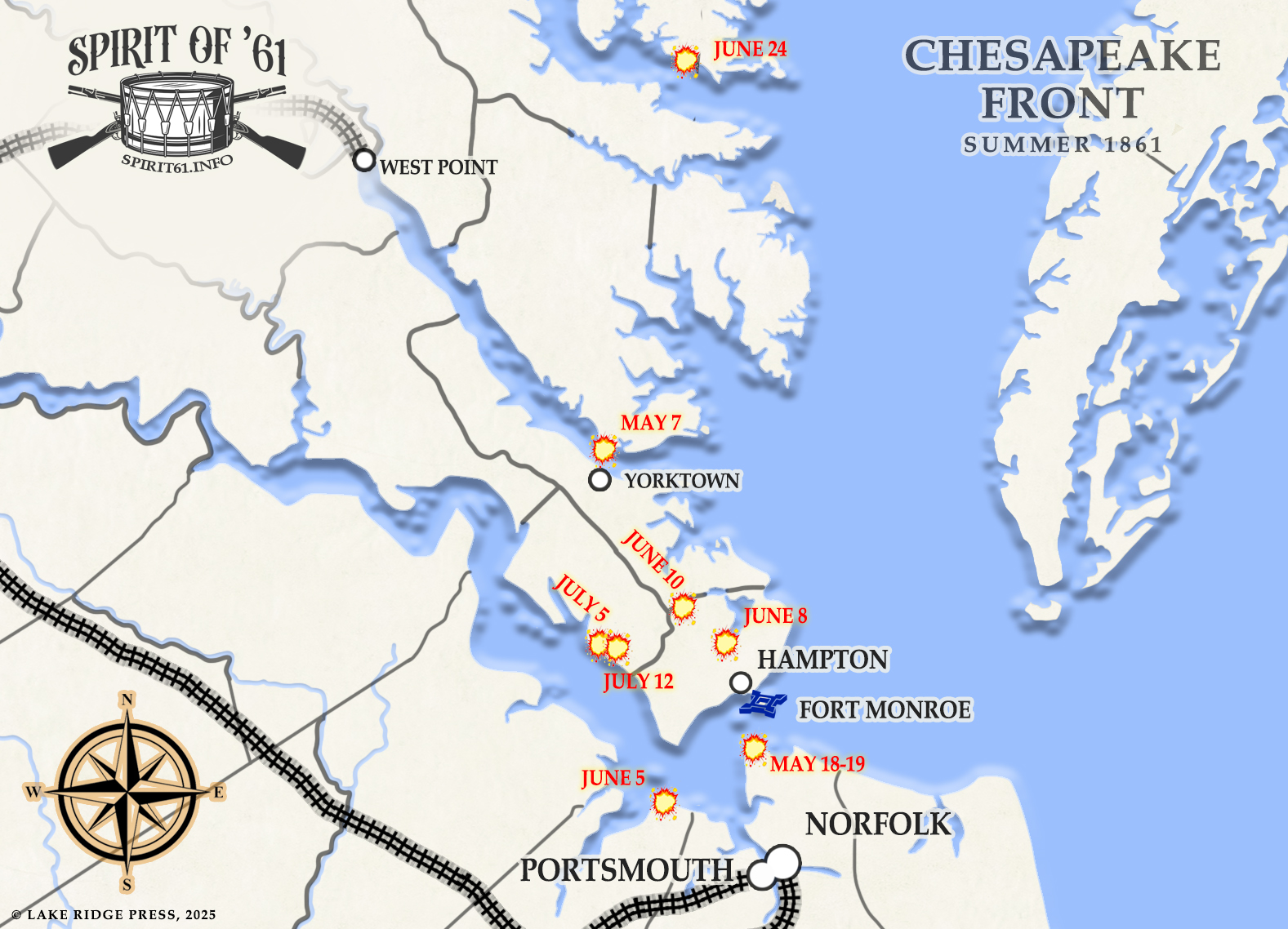 So far, I’ve identified 37 separate engagements in Virginia prior to the Battle of First Manassas (this includes territory that became West Virginia), and have separated them into three general geographic fronts, named after these principal waterways. This helps clarify the broader role each engagement played in early Civil War Virginia. The following chart lists the engagements, their dates, and locations on the Chesapeake Front.