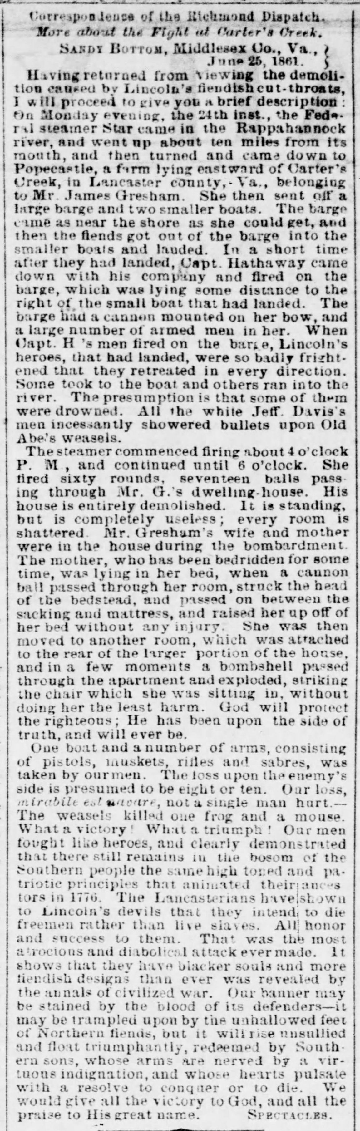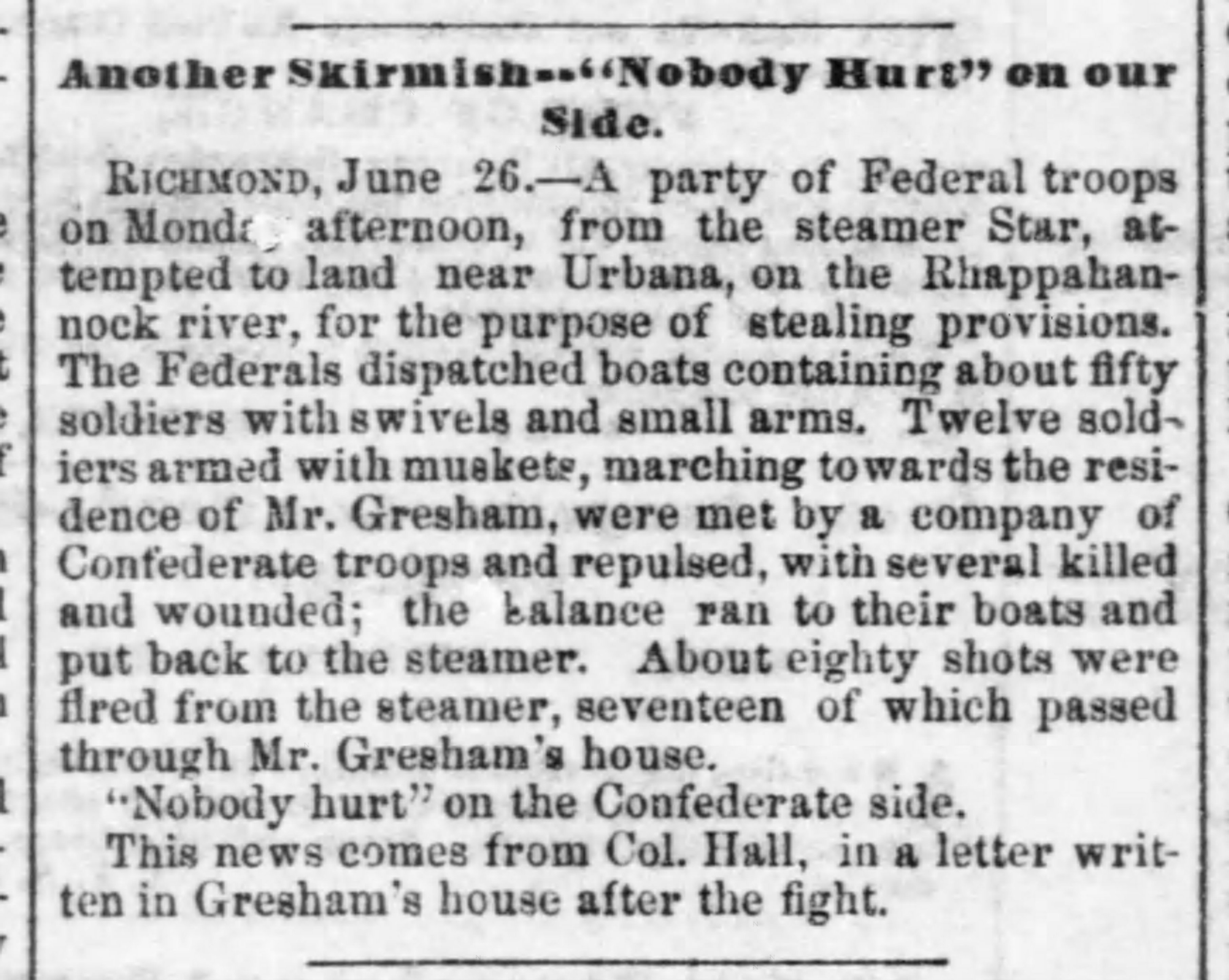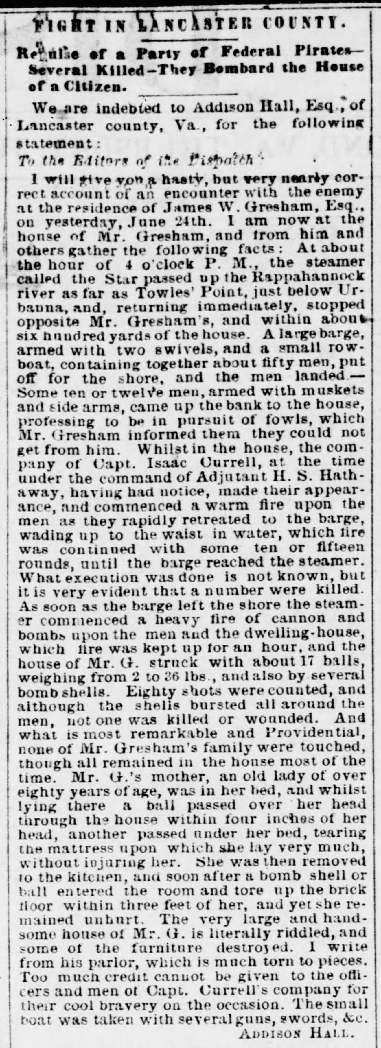The Monticello‘s pilot then mentioned that a man named James W. Gresham, who lived near the mouth of Carter’s Creek on the Northern Neck, might have useful information. A landing party of 18 armed men, led by Master’s Mate Lewis A. Brown and Assistant Surgeon Heber Smith, went ashore in the steamer’s launch—a small craft armed with two swivel guns and a rowboat. While speaking with Gresham, about 30 men from Currell’s Company, led by Adjutant Henry S. Hathaway, opened fire from behind bushes and trees along the shore.