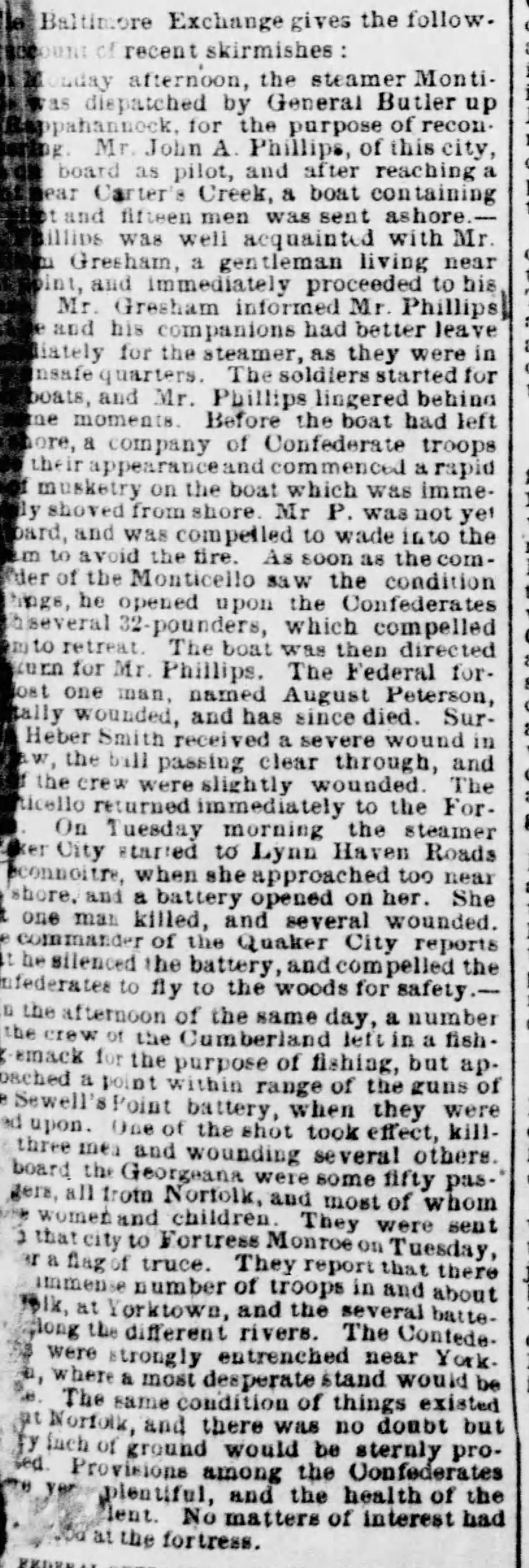 Once the landing party was safely back aboard the Monticello, Lt. Braine ordered his gunners to fire on Gresham’s house, called Pop Castle, causing severe damage. There were no reported Confederate casualties, and the Monticello returned to Fort Monroe empty-handed.