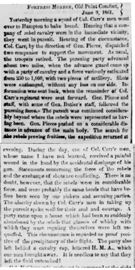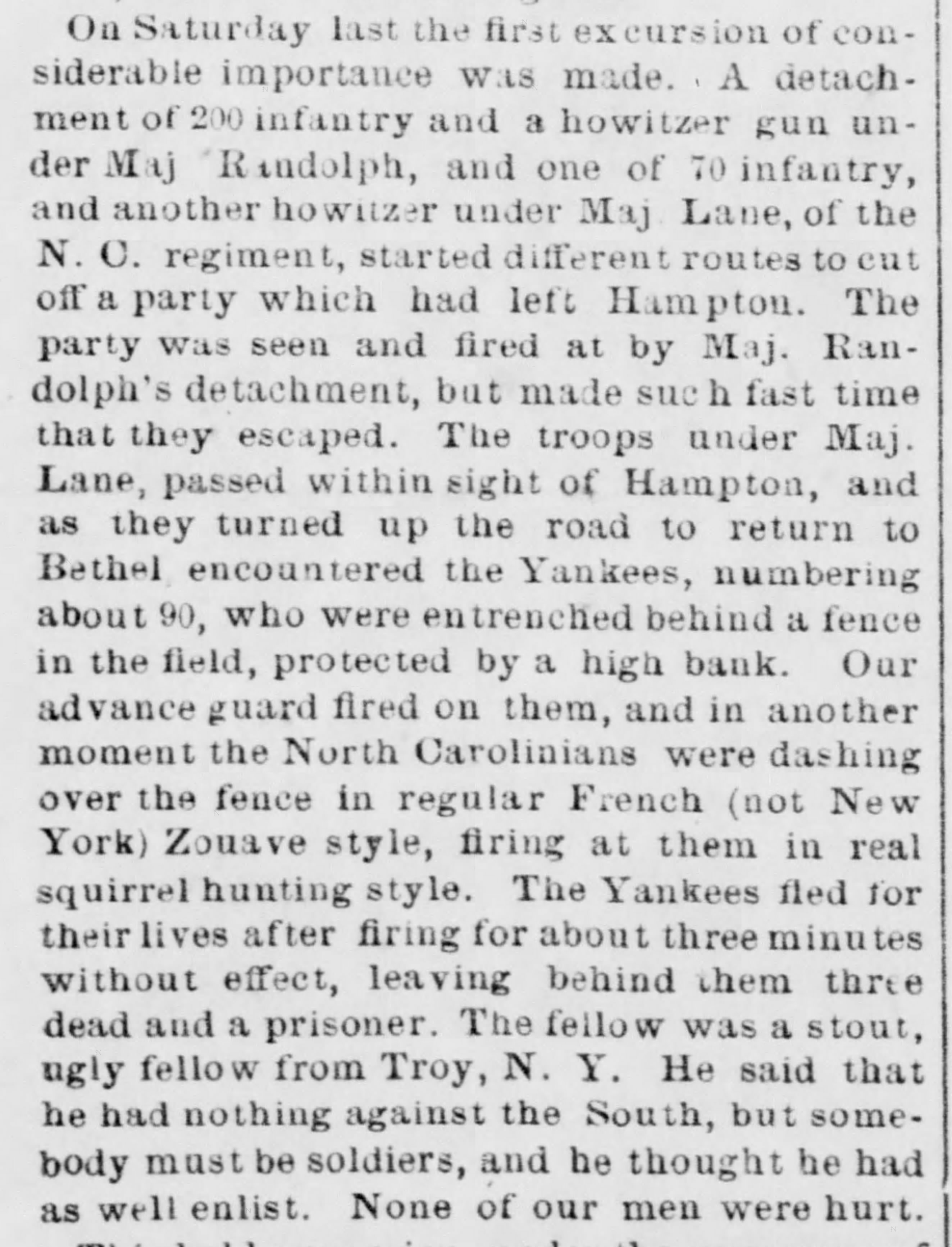 June 7, 1861: Capt. William H. Werth and the Chatham Grays make a reconnaissance on the Union fortifications at Newport News.