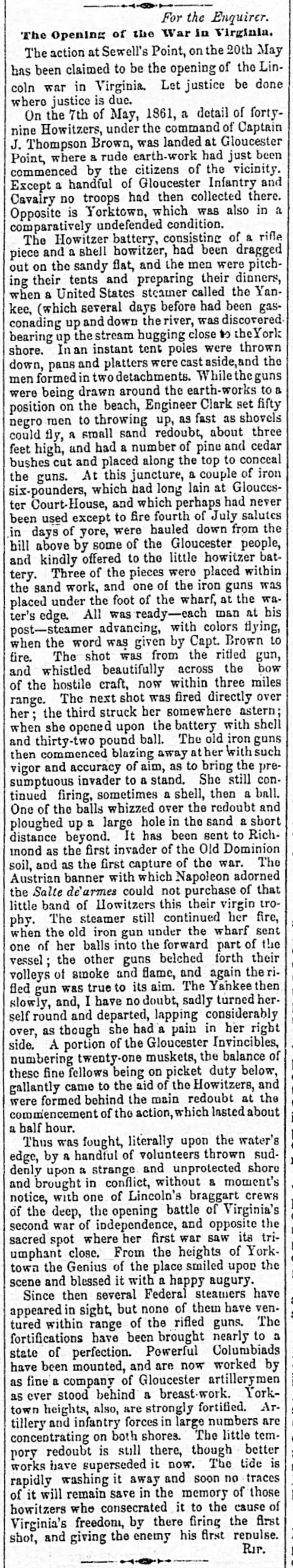 There is some controversy whether any of the Virginians’ shots hit the Yankee, but regardless, Lt. Selfridge saw the futility of continuing the engagement and sailed away after a few minutes. Neither side reported casualties. This brief exchange of fire was the first hostile engagement between Virginia and the U.S. government in the Civil War, occurring a little less than two weeks before Virginia formally seceded from the United States.