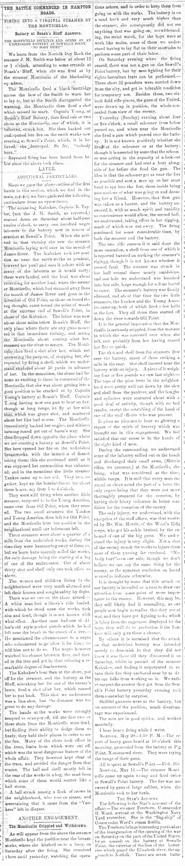 Saturday, May 18, 1861, Union forces observed Virginia engineers digging fortifications for the battery and sent the gunboat USS Monticello (temporarily operating under the name Star), commanded by Captain Henry Eagle, to investigate. The Monticello was armed with one 9-inch gun and two 32-pound guns. It fired several shots at the militia building the fort, to little effect.