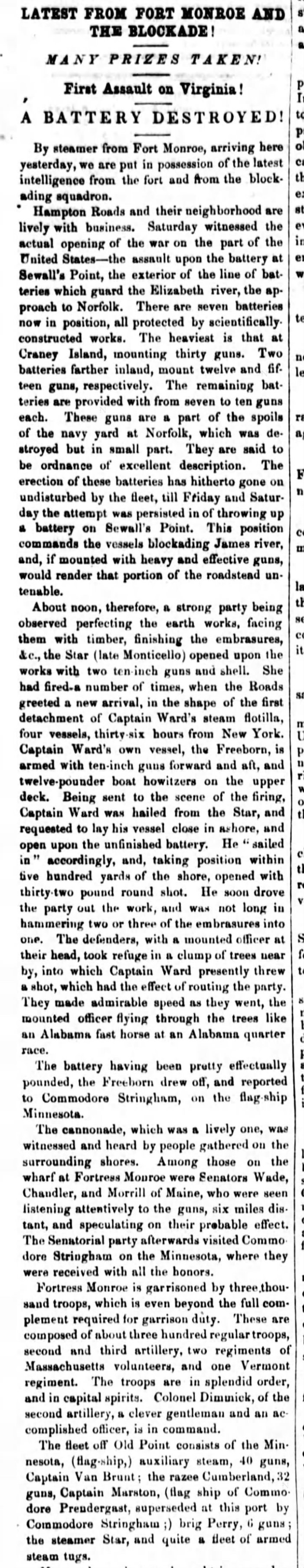 May 18-19, 1861: The USS Thomas Freeborn and Monticello exchange fire with a Confederate shore battery at Sewell’s Point.