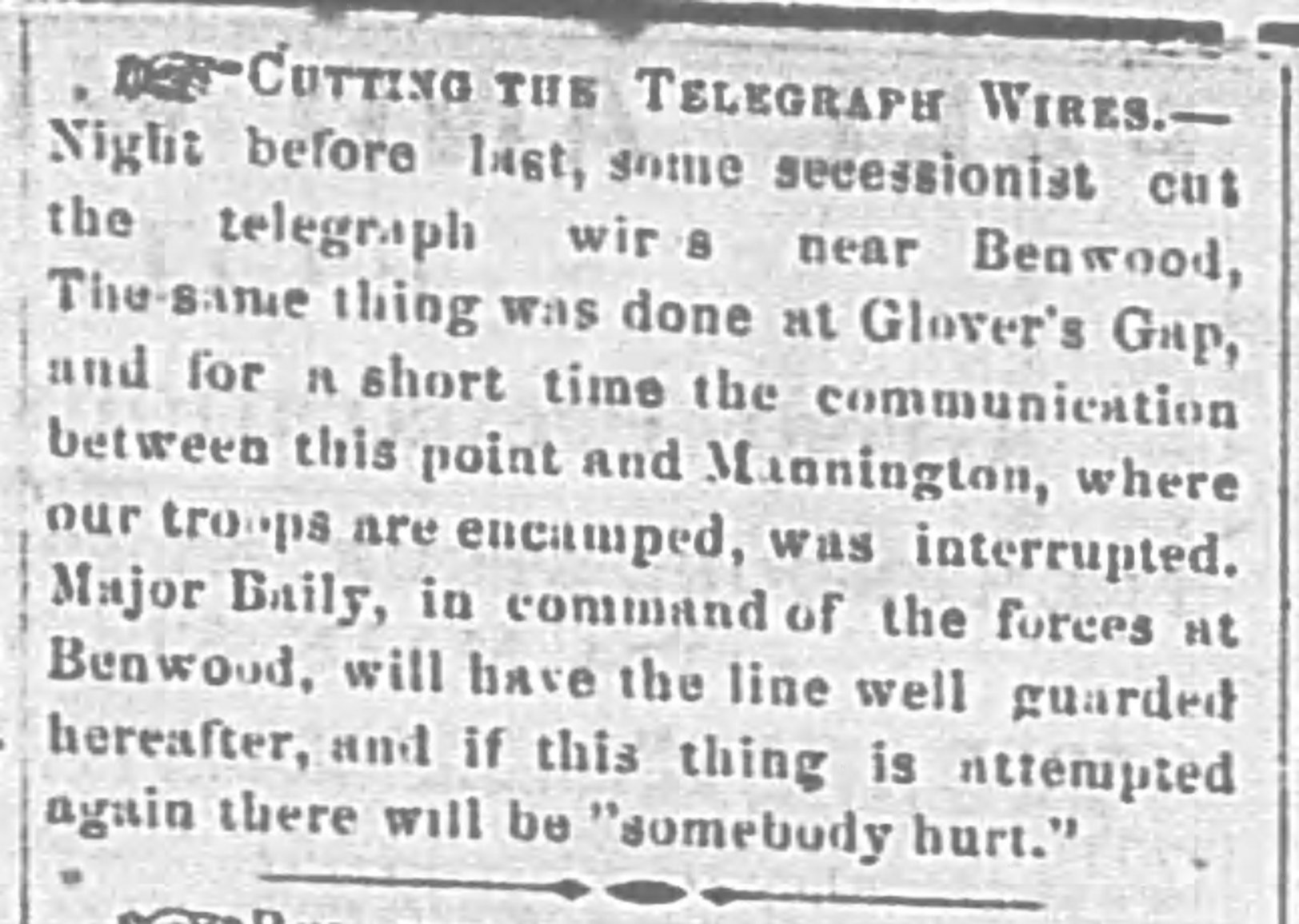 May 27, 1861: The 1st Virginia Regiment (Union) and Company A, 2nd Virginia (U.S.) reach Mannington and search the area for secessionists that cut telegraph wires and threatened nearby railroad bridges.