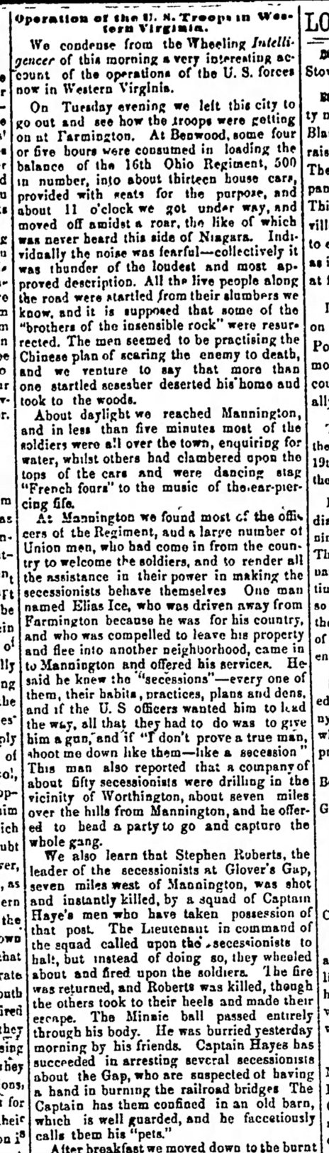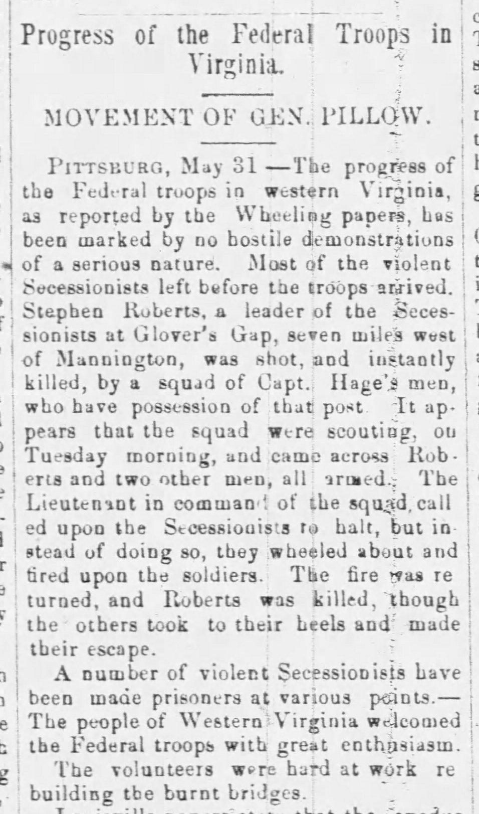 At the end of May 1861, a Union detachment confronted secessionist militia at Glover’s Gap, resulting in the death of its defiant leader, Stephen Roberts. Whether Roberts was a Confederate officer or simply a rogue partisan remains unclear, but his death was among the first in the Union effort to control Northwest Virginia.