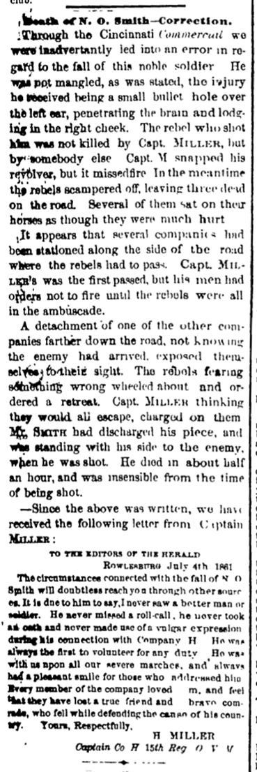 A son of Richland county has fallen in defence of his country. On the 29th ult [?] a skirmish took place at Bowman’s, about 12 miles from Cheat River Bridge, on the Baltimore and Ohio Railroad, between the 15th and 16th Ohio regiments, and some rebels. The rebels were routed with a loss of several men. We had one killed; Mr. N.O. Smith, of Capt. Miller’s Company. Mr. S. lived about five miles from this city. His occupation was school teaching, but when he volunteered, he was a student at the Hayseville Seminary. He was an excellent young man, and died as a gallant soldier would desire to die–on the field of victory.