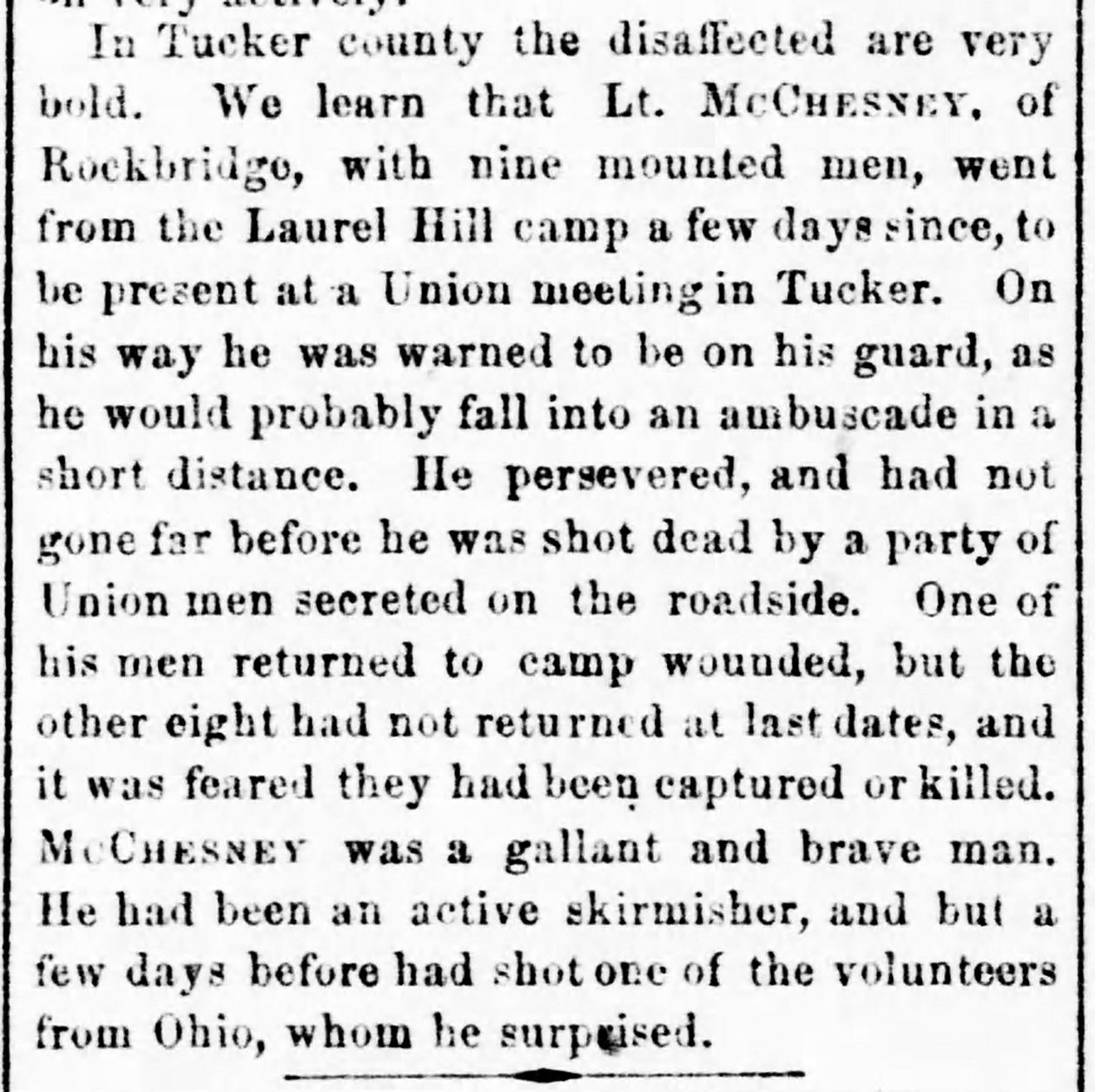 In Tucker County the disaffected are very bold. We learn that Lt. McChesney, of Rockbridge, with nine mounted men, went from the Laurel Hill camp a few days since, to be present at a Union meeting in Tucker [County]. On his way he was warned to be on his guard, as he would probably fall into an ambuscade in a short distance. He persevered, and had not gone far before he was shot dead by a party of Union men secreted on the roadside. One of his men returned to camp wounded, but the other eight had not returned at last dates, and it was feared they had been captured or killed. McChesney was a gallant and brave man. He had been an active skirmisher, and but a few days before had shot one of the volunteers from Ohio, whom he surprised.