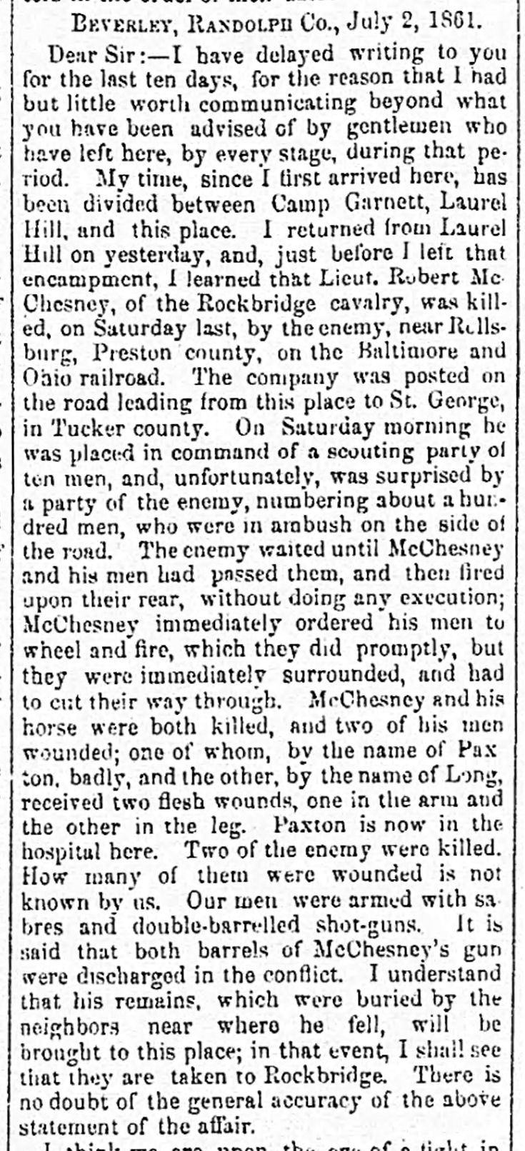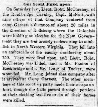 On Saturday last, Lieut. Robt. McChesney, of the Rockbridge Cavalry, Capt. McNutt, with nine others of that Company ventured from camp Garnett a distance of about 20 miles in the direction of Rollsburg where the Unionists were holding an election for the New Government they are traitorously endeavoring to establish in North Western Virginia. They fell into an ambuscade of the enemy numbering about 150. They were fired upon, and Lieut. Robt. McChesney was killed, and a Mr. Paxton of Rockbridge and a Mr. Long of Tucker, were wounded. Mr. Long joined that company after it arrived at Camp Garnett. The other members of this scouting party made their escape unhurt, though the balls passed through portions of their clothing and five or six of their horses were killed.
