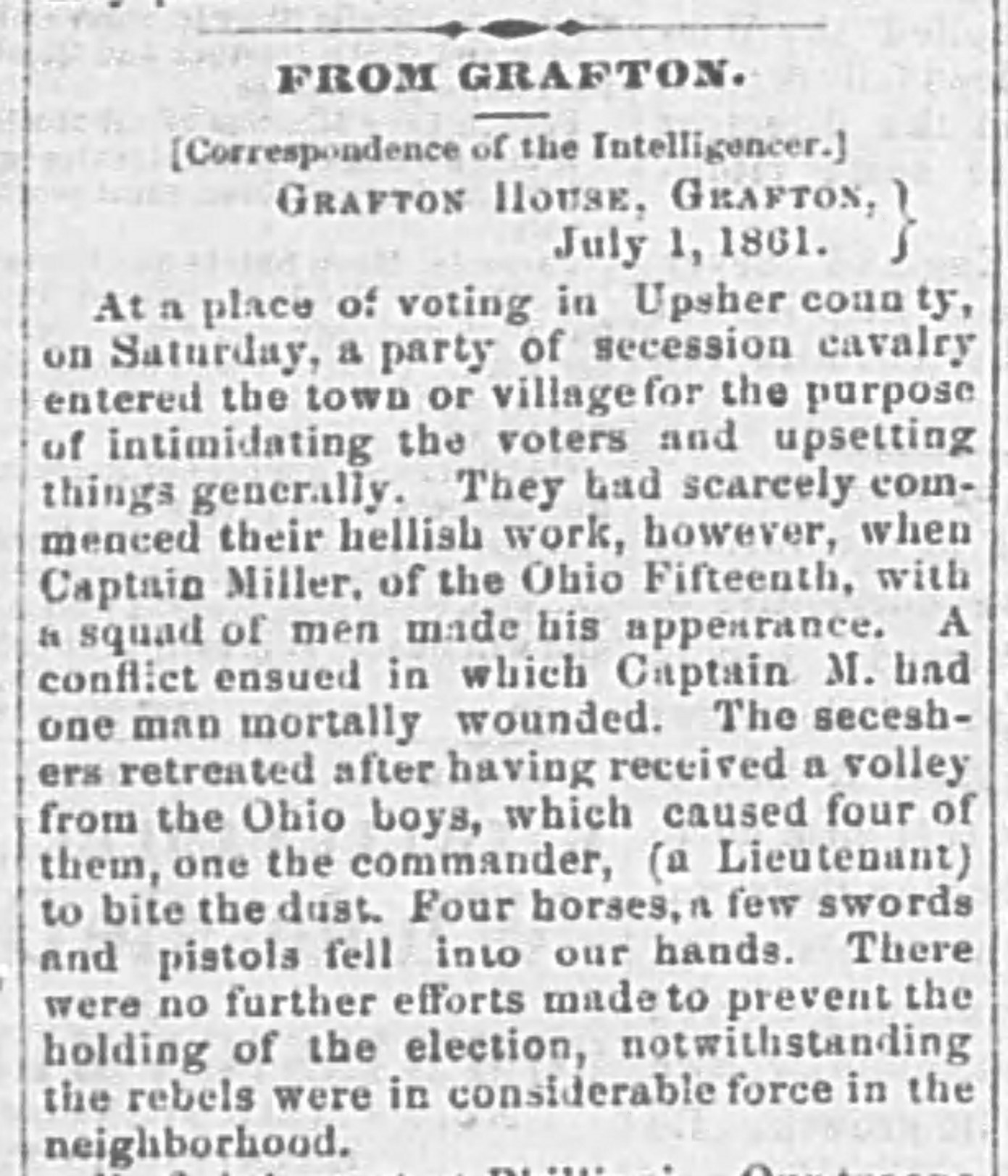 GRAFTON, June 30. — A skirmish took place at Bowman’s, 12 miles from the Cheat river bridge, yesterday, between portion of the 15th and 16th Ohio and 1st Virginia regiments and a company of rebel cavalry, the former were went to protect the pol [polls?], and the latter, mistaking their number, attacked them and were routed with the loss of several men, among them the Lieutenant of the company, and several horses. The only loss on our side was N.O. Smith, of the 15th, who was buried here to-day.