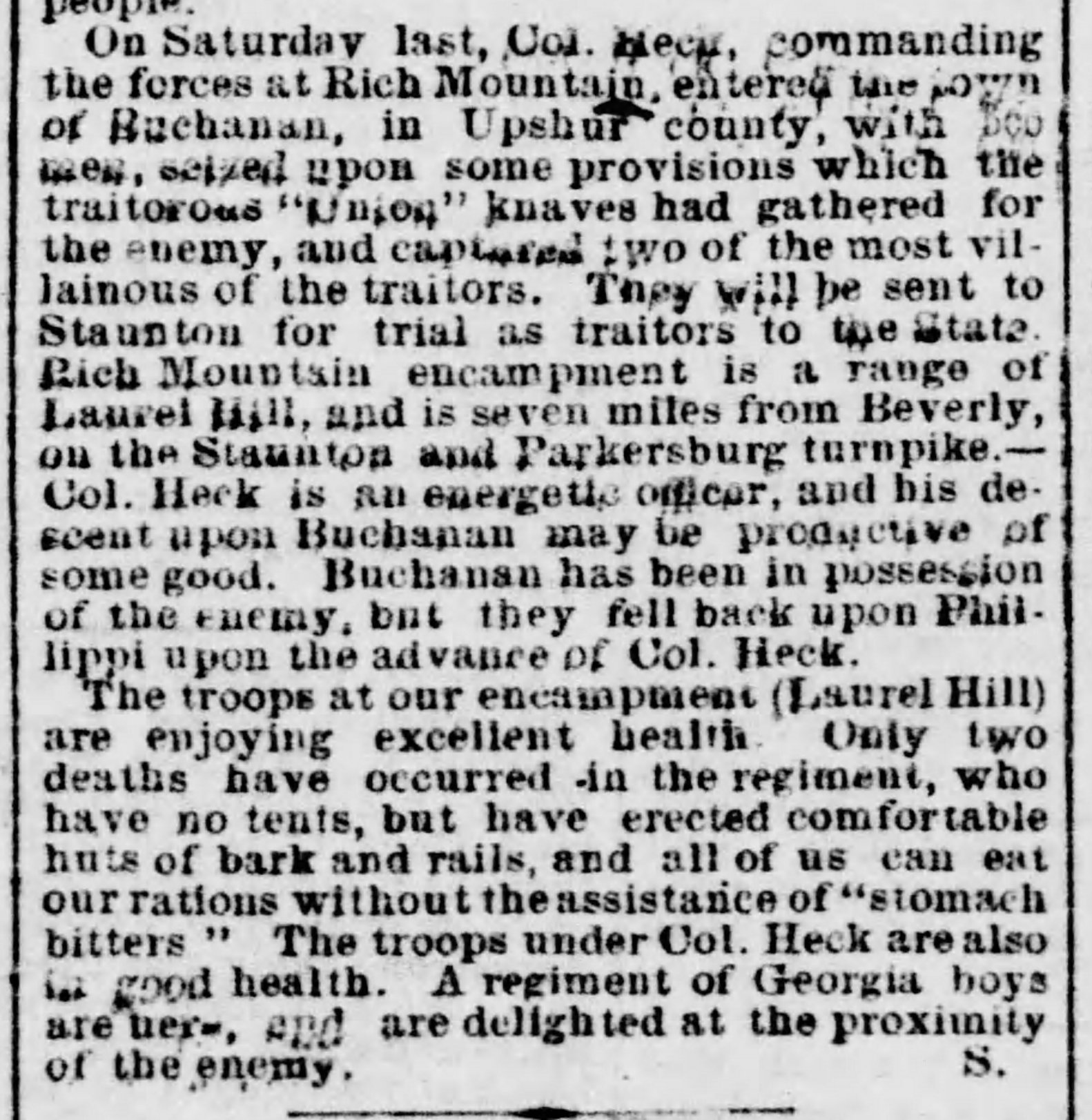 On June 26, Lt. Col. Heck took his men and wagons and marched toward Buckhannon, looking for supplies. Buckhannon, population 427 in 1860, is the seat of Upshur County. It is located along the Buckhannon River and Staunton-Parkersburg Turnpike. The Turnpike was a vital transportation route from the Shenandoah Valley to the Ohio River. Buckhannon, approximately 23 miles east of the Confederate camp on Rich Mountain, became a kind of no man’s land between Confederate forces and Union forces camped at Philippi and Clarksburg.