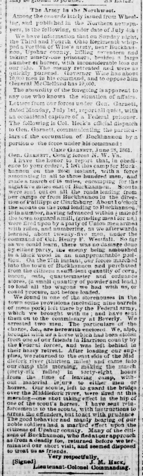 June 25, 1861: Garnett orders Lt. Col. Heck to take his wagons on a foraging expedition to Buckhannon.