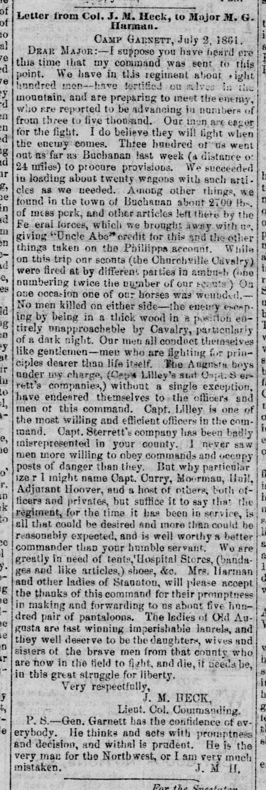 Towards the end of May, Porterfield sent Lt. Col. Jonathan McGee Heck (1831-1894), an attorney from Marion County, (West) Virginia, to Richmond to explain, in person, the dire situation they faced. Heck was in Staunton gathering reinforcements and supplies during the Philippi disaster. When Heck returned to the Northwest, Confederate forces had a new commander in the form of Brig. Gen. Robert S. Garnett. Garnett placed Heck in command of the 25th Virginia Infantry Regiment and ordered him to fortify Rich Mountain.