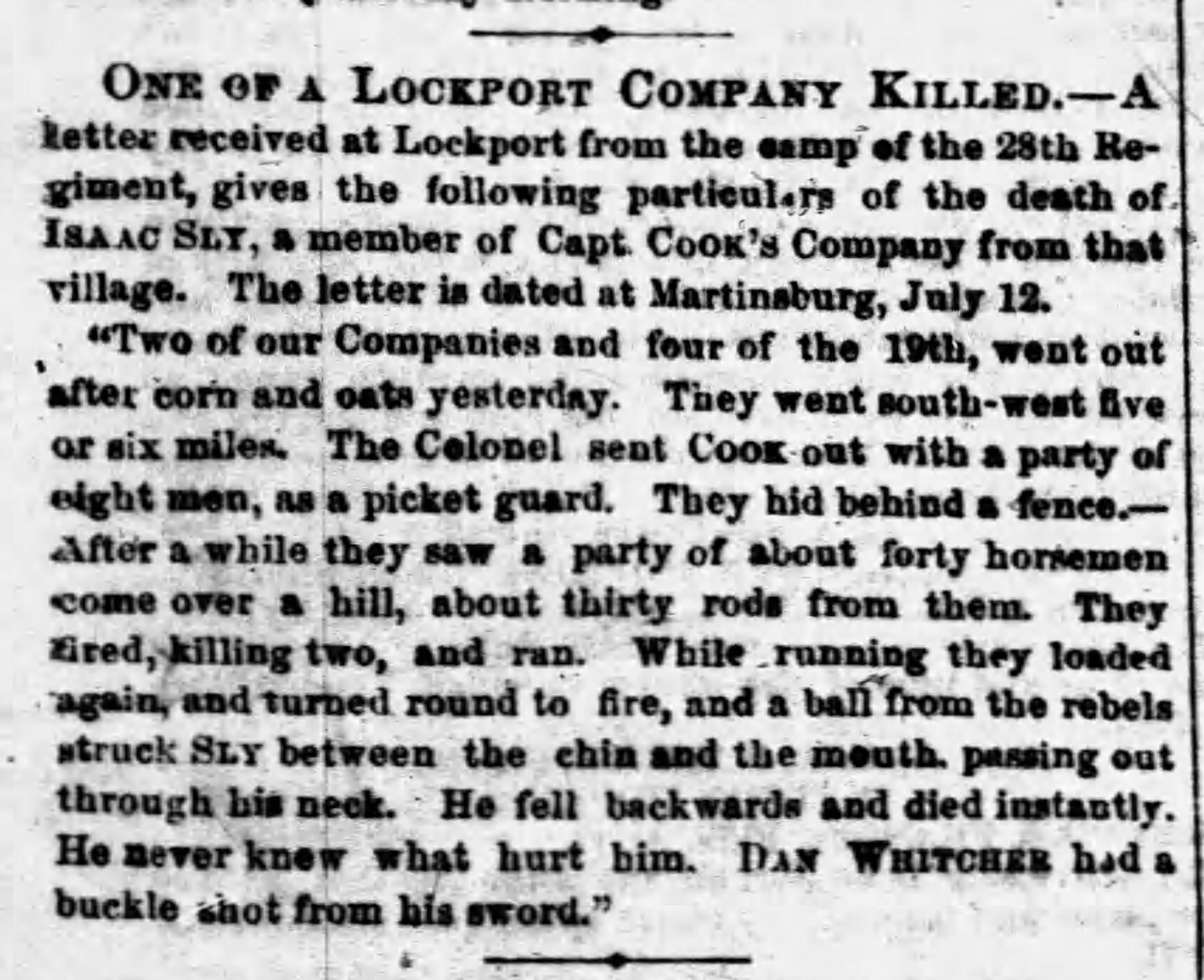 Meanwhile, the main Union foraging party reached a farm about five miles southwest of Martinsburg. Capt. Elliot W. Cook, Lt. Daniel R. Whitcher, 20-year-old Private Isaac W. Sly, and five others from Company A, 28th New York, formed an advance guard to watch the road. Before long, they saw a body of cavalry approaching at full gallop and opened fire.