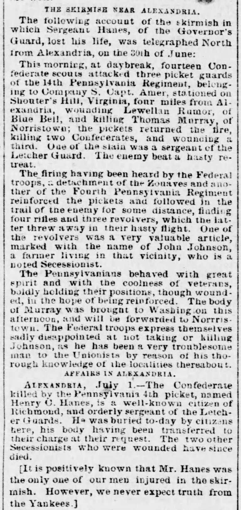Alexandria, July 1 — The Confederate killed by the Pennsylvania 4th picket, named Henry C. Hanes, is a well-known citizen of Richmond, and orderly sergeant of the Letcher Guards. He was buried today by the citizens there, his body having been transferred to their charge at their request. The two other Secessionists who were wounded have since died.