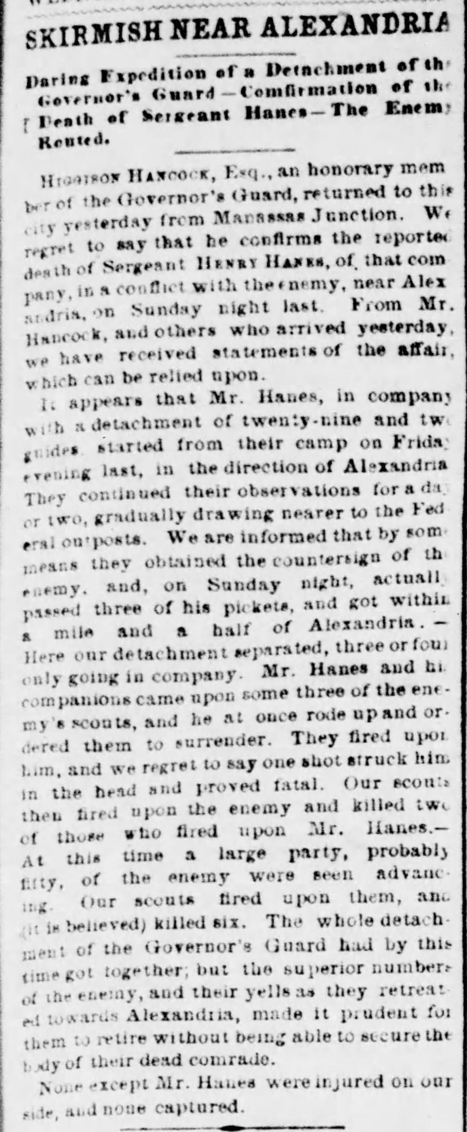 The following account of the skirmish in which Sergeant Hanes, of the Governor’s Guard, lost his life, was telegraphed North from Alexandria, on the 30th of June: