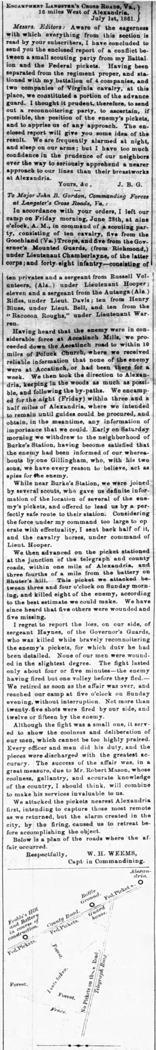 On the morning of Friday, June 28, Major John B. Gordon of the 6th Alabama Infantry Regiment ordered Captain Walter H. Weems to lead a scouting expedition toward Alexandria. Weems’ force included 48 infantry and 10 cavalrymen from the Governor’s Mounted Guard and Goochland Cavalry, with Lieutenant Francis W. Chamberlayne commanding the cavalry scouts.