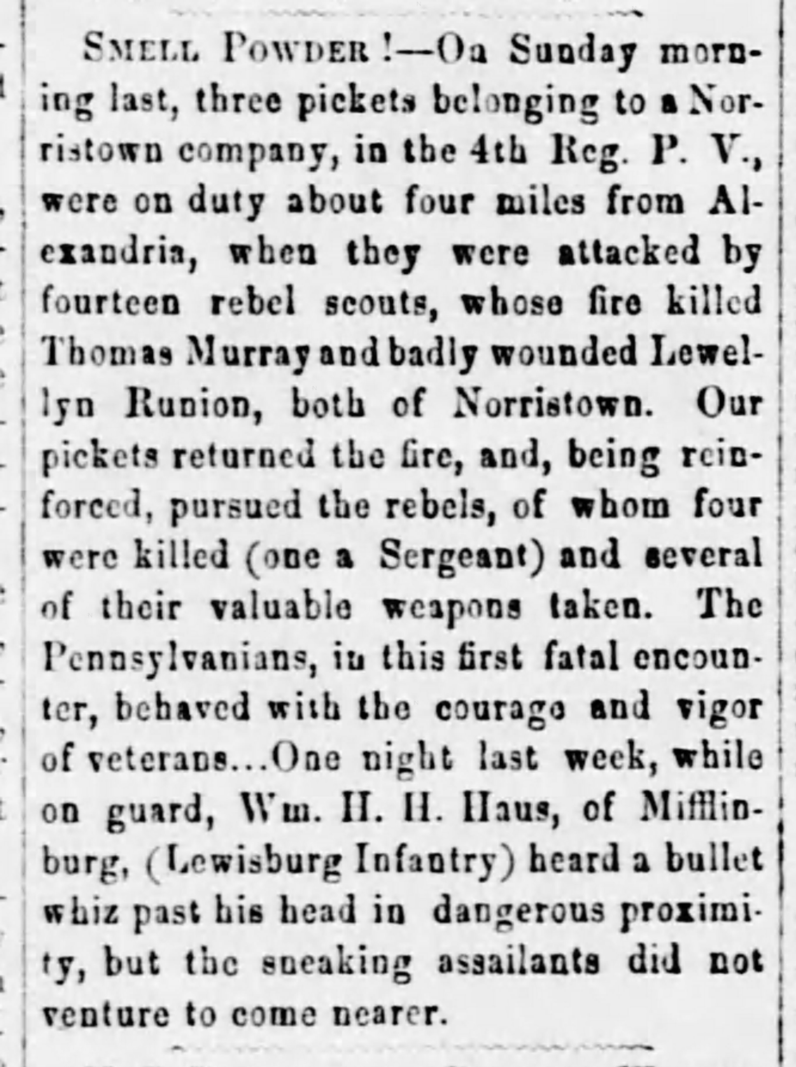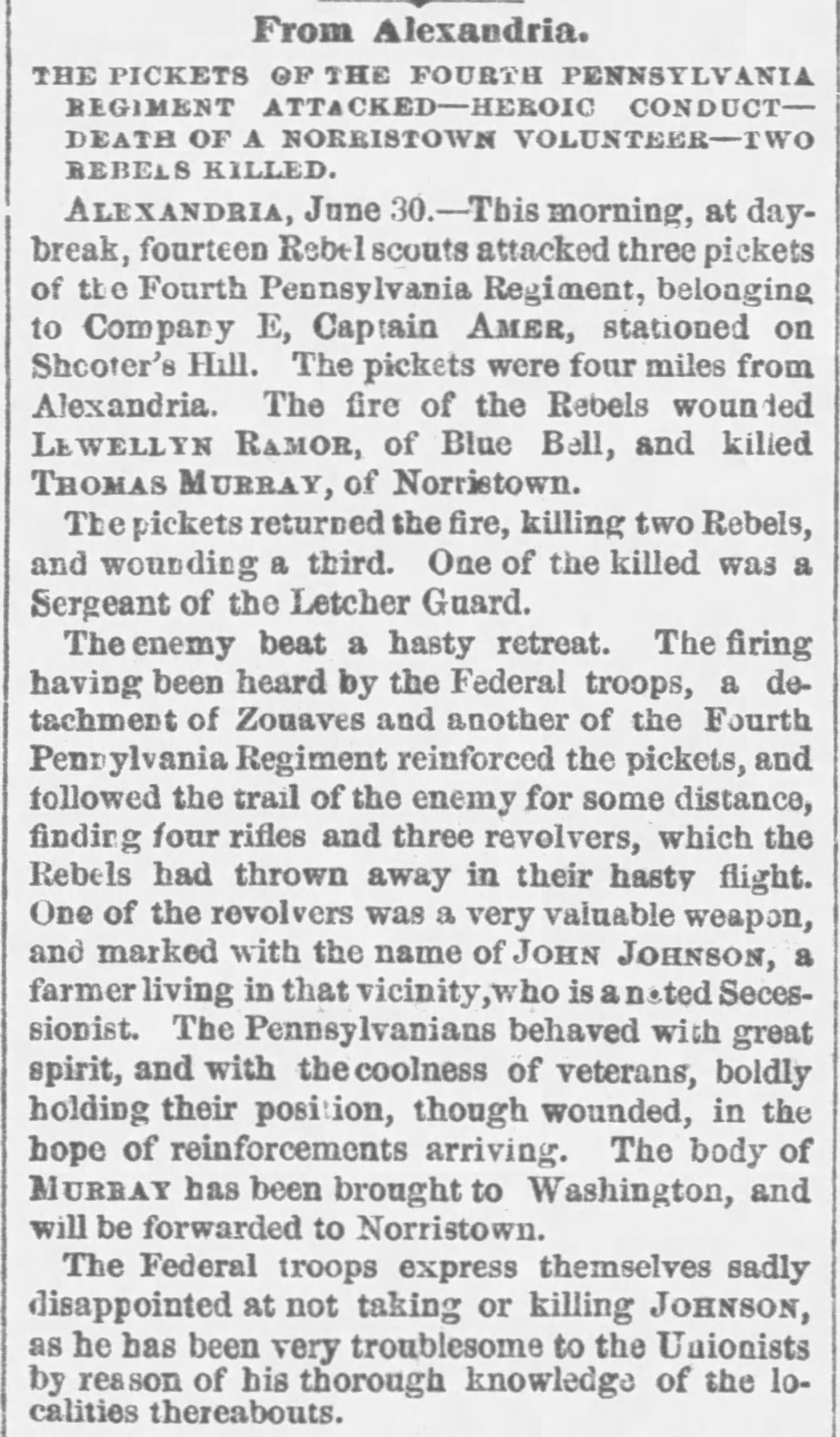 This morning, at daybreak, fourteen Confederate scouts attacked three picket guards of the 14th Pennsylvania Regiment, belonging to Company S, Capt. Amer, stationed on Shouter’s Hill, Virginia, four miles from Alexandria, wounding Lewellan Rumor, of Blue Bell, and killing Thomas Murray, of Norristown; the pickets returned the fire, killing two Confederates, and wounding a third. One of the slain was a sergeant of the Letcher Guard. The enemy beat a hasty retreat.