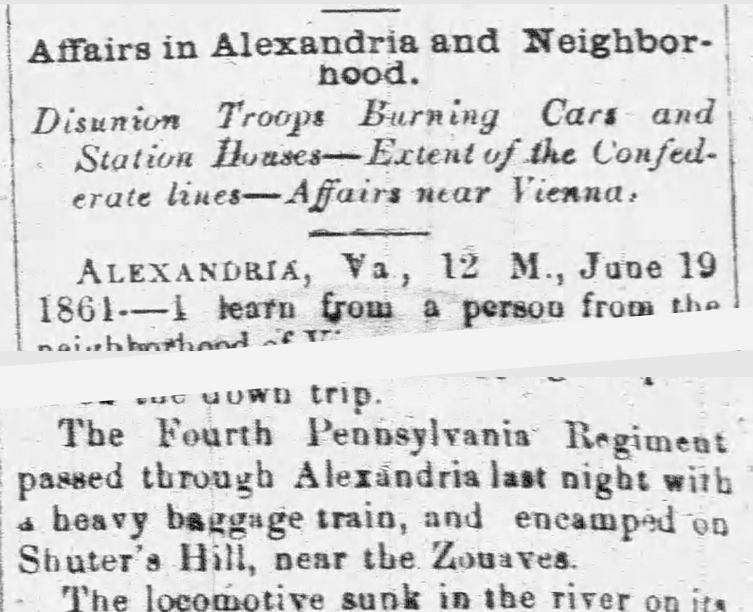 June 18, 1861: 4th Pennsylvania Volunteer Infantry is ordered to reinforce Alexandria, Virginia, and arrives at Camp Hale on Shuter’s Hill that evening.