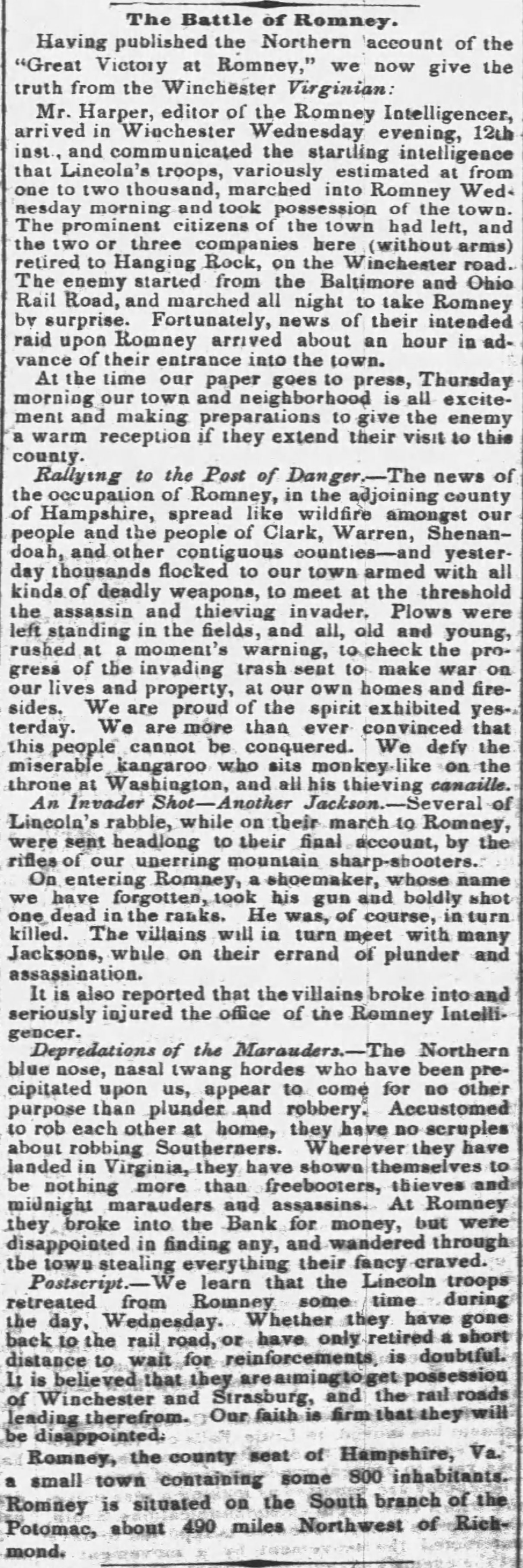 Though Wallace pledged not to harass any unarmed citizens, his men did destroy the printing press and offices of the South Branch Intelligencer. Satisfied, Wallace withdrew his troops the next day. Confederate Col. Turner Ashby and his cavalry occupied Romney by June 17th, leading to another skirmish at Frankfort and Patterson’s Creek.