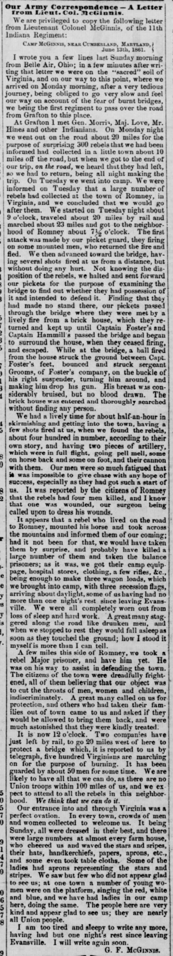 Five hundred men from the 11th Indiana proceeded by train the night of June 12, then plodded along rough mountain roads the next morning. The 21-mile trip turned into an 87-mile slog. Confederates had advanced notice of their arrival and were posted on a hill behind the bridge Wallace’s men would have to cross to enter Romney.