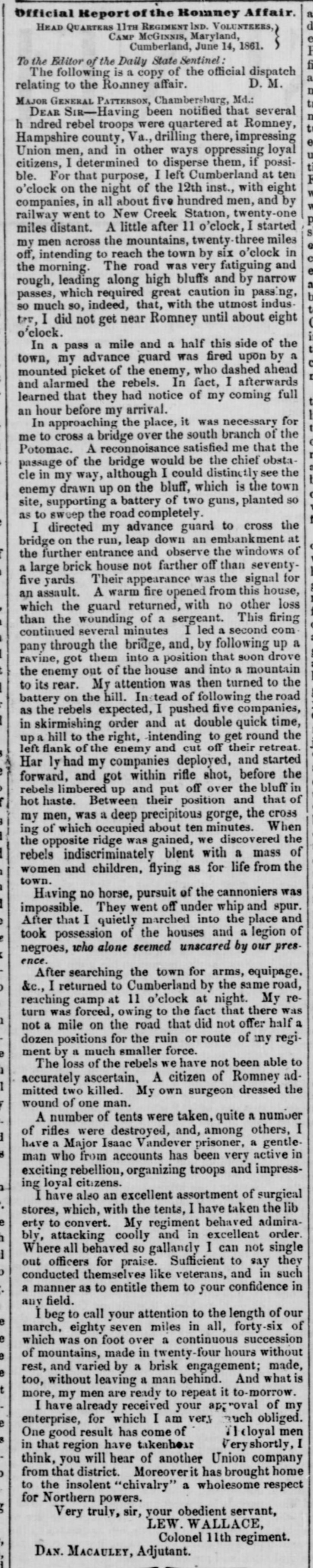- June 14th Report of Colonel Lew. Wallace, Eleventh Indiana Infantry