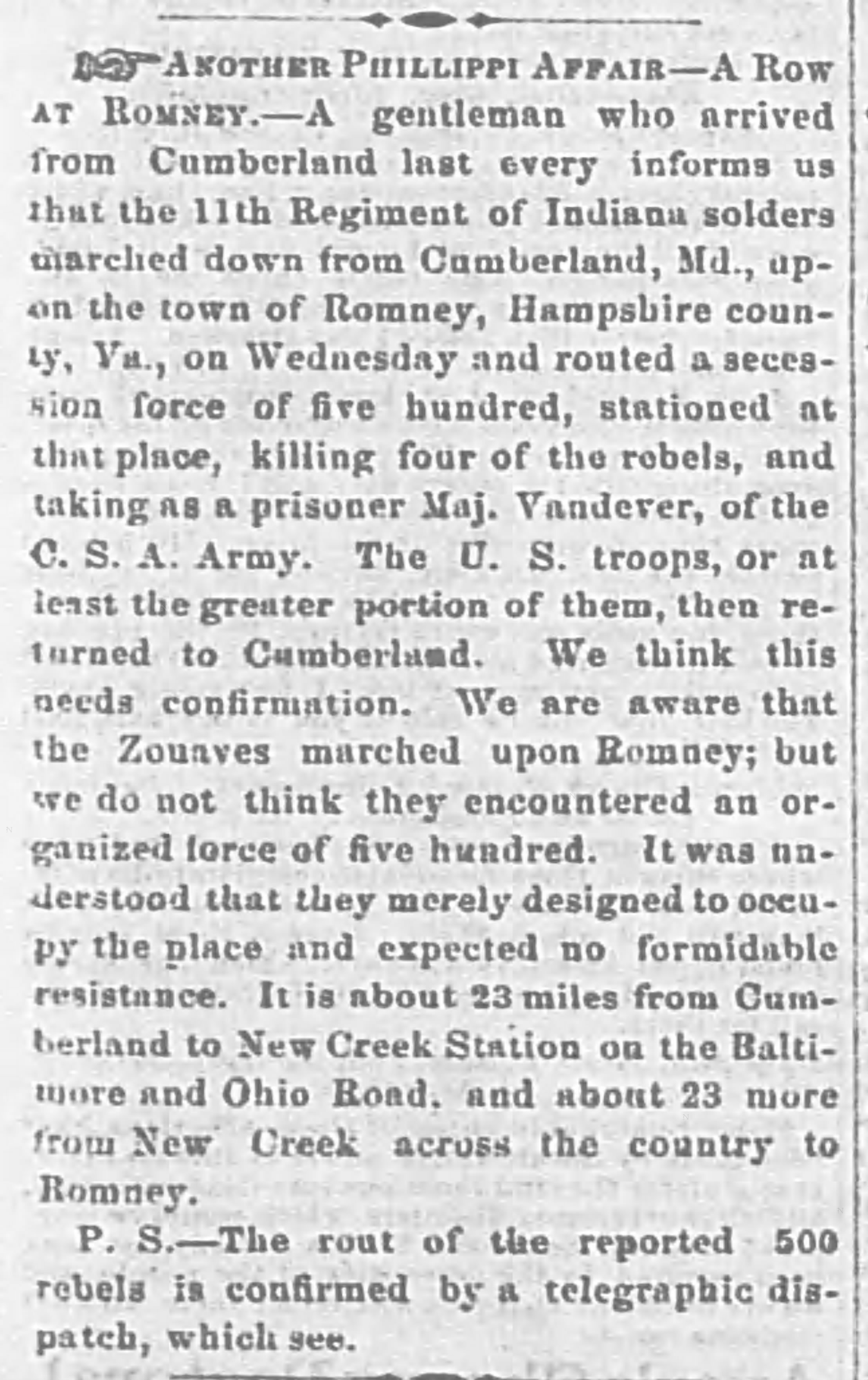 Wallace heard a body of secessionist forces were camped in Romney, Virginia, 21 miles south along the South Branch of the Potomac River. These were two companies from the 33rd Virginia Infantry Regiment: the Potomac Guards and Independent Greys (Company A and F) under Col. Arthur C. Cummings, and the Hampshire Riflemen, which later became Company F, 7th Virginia Cavalry Regiment.