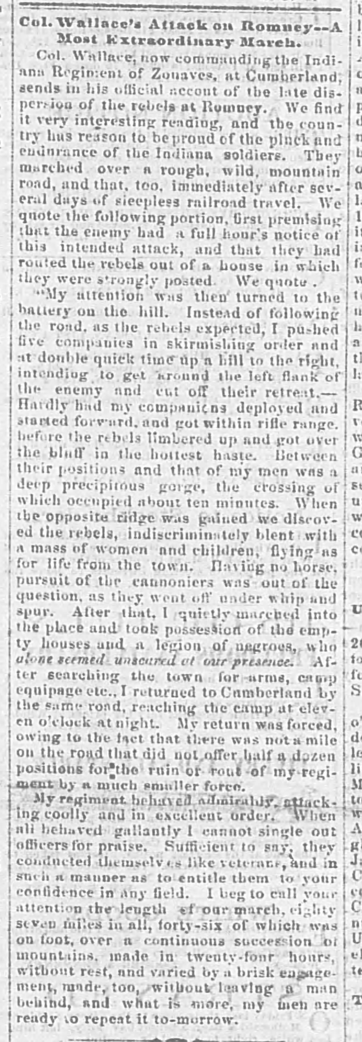 June 12-13, 1861: Col. Lewis “Lew” Wallace leads 500 men from the 11th Indiana on an 87-mile march by rail and foot to Romney.