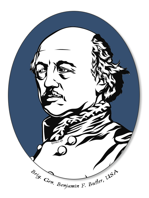 Benjamin Franklin Butler (1818–1893) played a crucial but controversial role in the early Civil War. He was a lawyer and politician from Massachusetts. Despite having no military experience, he secured a rank as brigadier general of Massachusetts volunteers and was sent south to secure the railroads to Washington, DC. In Baltimore, Maryland, Butler suppressed a secessionist riot. He ran afoul of Gen. Winfield Scott for, without orders, sending two regiments to reinforce Fort Monroe in the Chesapeake Bay. Scott assigned him to Fort Monroe, which he aggressively defended, most notably blundering into the first major Union defeat at the Battle of Big Bethel. While at Fort Monroe, he accepted slaves who fled from nearby plantations and impounded them as “contraband of war”, setting the precedent for Union armies to shelter escaped slaves under wartime authority.