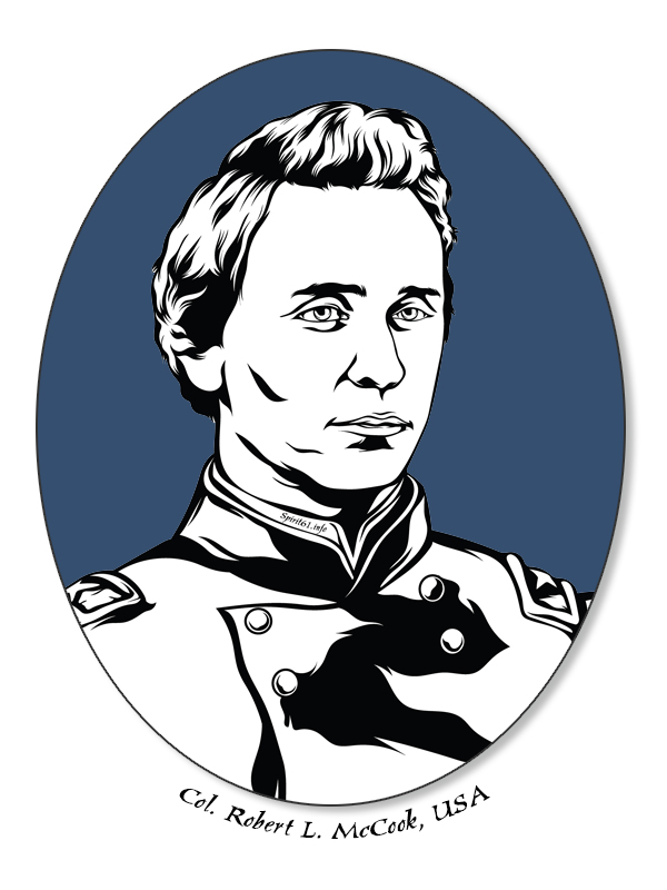 Robert Latimer McCook (1827-1862) was a lawyer from Ohio, one of nine children of Daniel McCook. Robert, seven of his brothers, and his father all fought for the Union during the Civil War. Their family was known as the “Fighting McCooks”. When the Civil War broke out, Robert recruited the 9th Ohio Infantry from among the German-American population of Cincinnati and became its colonel. He was promoted and given command of a brigade under George B. McClellan, which saw action throughout the Northwestern Virginia campaign in the early summer of 1861. Robert was killed in northern Alabama in 1862.