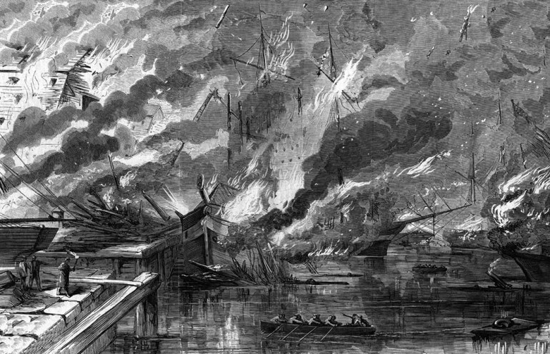 The USS Thomas Freeborn and Monticello exchange fire with a Confederate shore battery at Sewell’s Point.