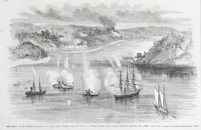 The USS Thomas Freeborn, USS Anacostia, USS Resolute, and USS Pawnee exchange fire with a Confederate shore battery at Aquia Creek in the Potomac River.