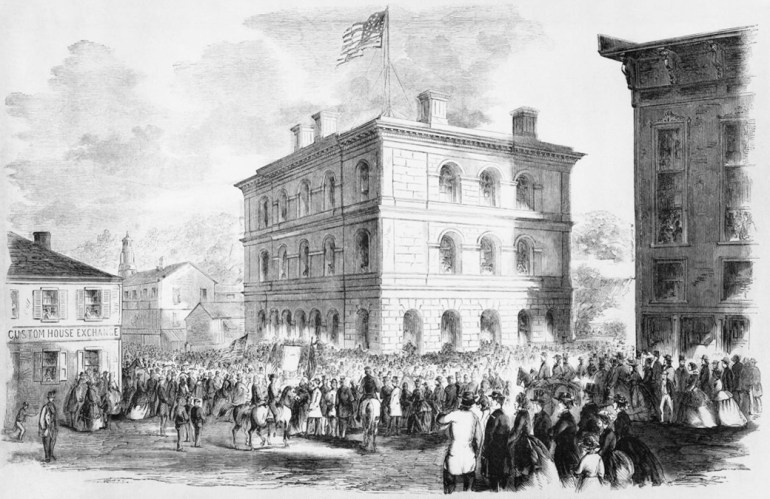 Secession supporters in Richmond sieze the U.S. Customs House. That night, a torchlit parade marches through Richmond’s main streets, led by the Richmond Armory Band and marshals on horseback.